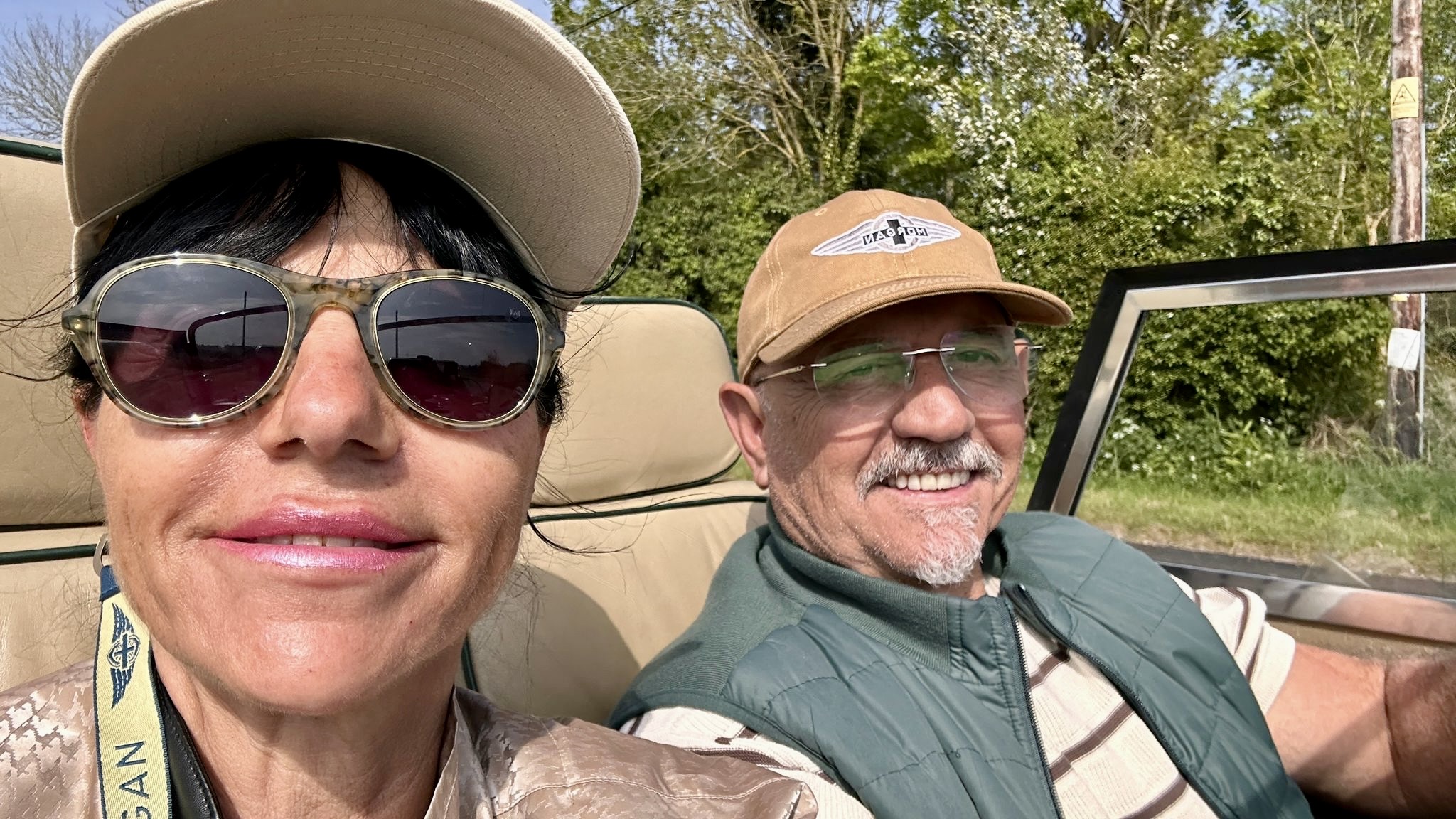 Angie se ha curtido viajando en el Morgan bajo el sol, la niebla, la lluvia, incluso algo de nieve y por supuesto, el viento – “para ir en Morgan tienes que vestirte en plan sport, en invierno desde luego con una buena chaqueta, normalmente el coche va tapado, con lo cual con el cabello no tenemos mucho problema, pero siempre tener una pinza, una goma o la gorra a mano. La cosa se complica cuando llevas el Morgan descapotado, ahí es imprescindible la gorra, loción con protección solar, unas gafas o dos pares de gafas mejor, porque una se te van a volar por el viento, seguro, y también un chubasquero o paraguas, que nunca se sabe, ¡ah! y ojo con lo de llevar pantalón corto, falda corta, porque te quemas las piernas, los brazos y todo lo que pillas, insisto en la protección solar, por favor”.