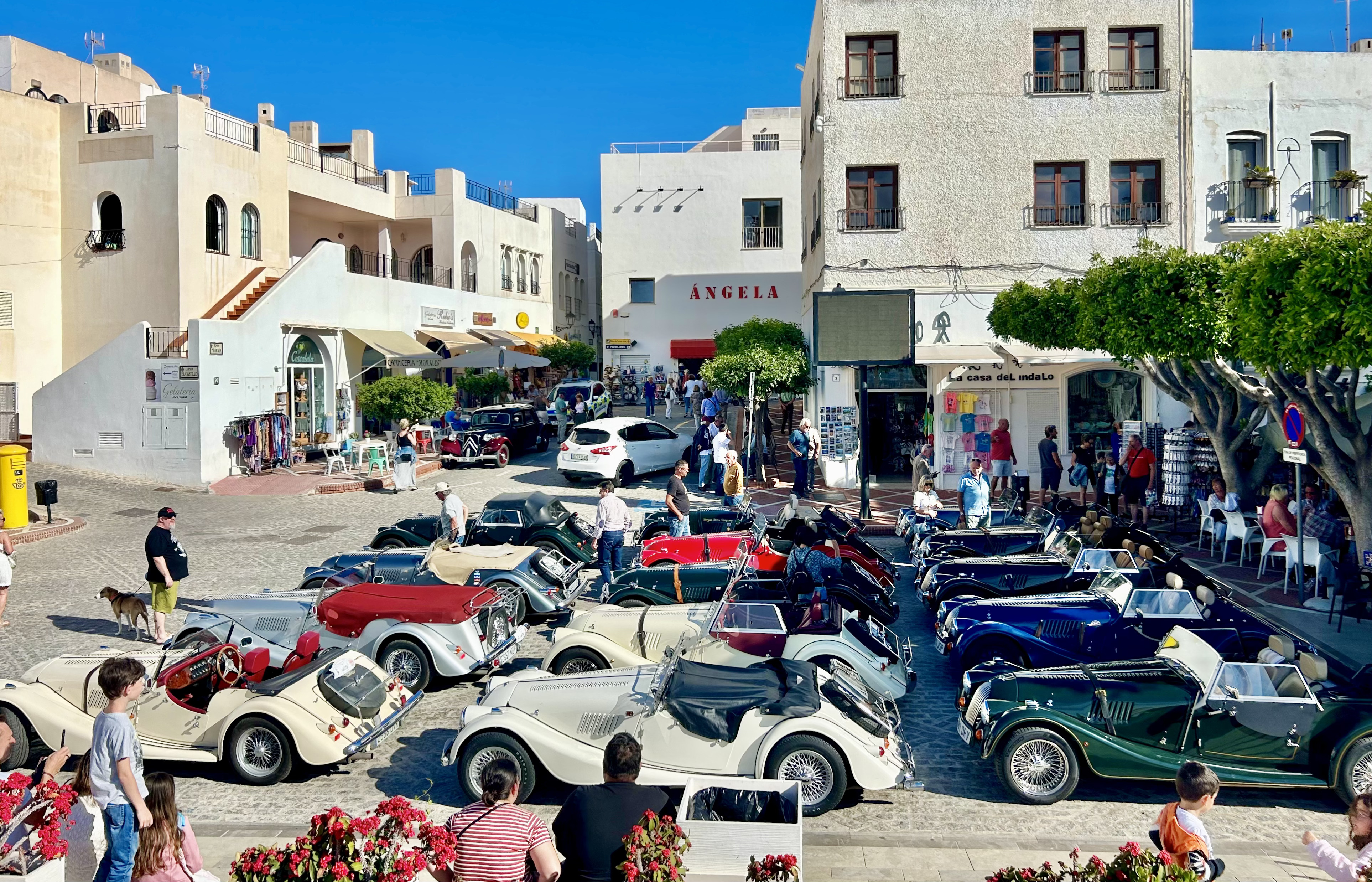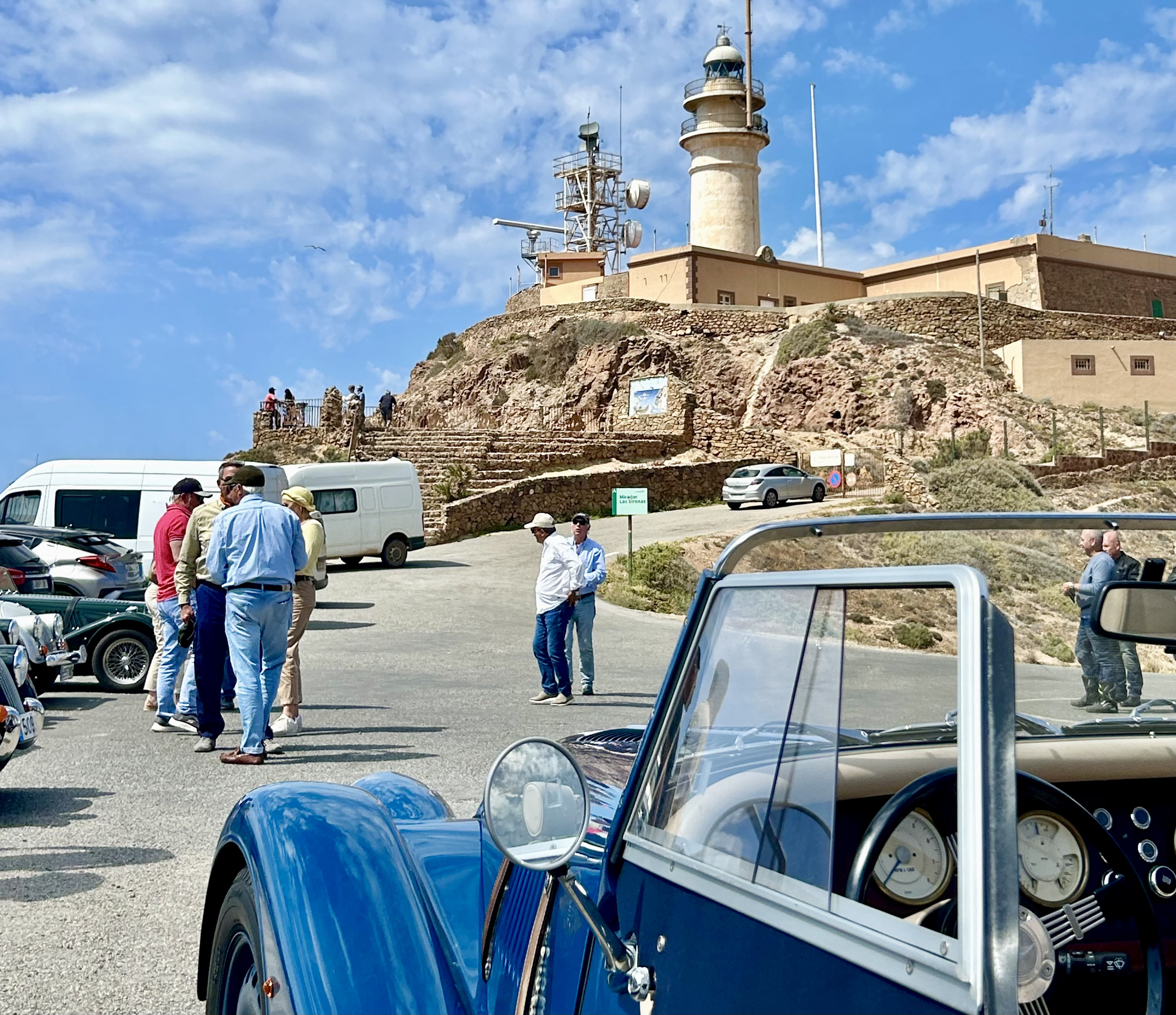 La ruta partía desde Aguamarga, con base en un pequeño hotel situado en lo alto de un cerro con vistas al mar, tan encantador como limitado en plazas. Lo previsto eran 12 coches… pero el entusiasmo fue tal que acabaron siendo 15 Morgan los que se agruparon, perfectamente acoplados, sin perder ni un ápice de comodidad ni de espíritu.